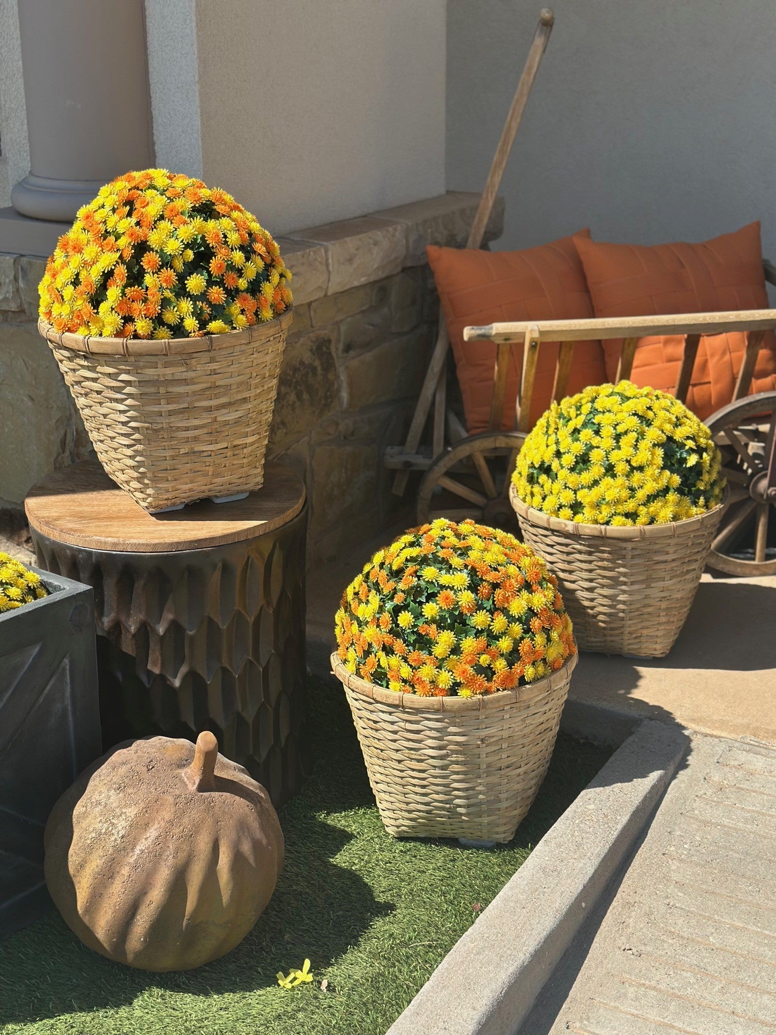 Just in time for the fall season. These UV protected faux mum balls won't last long - 2 color options: yellow or orange/yellow. Large mum ball that can fit in a pot or be staked to ground. Create an inviting and warm welcome on your front porch.