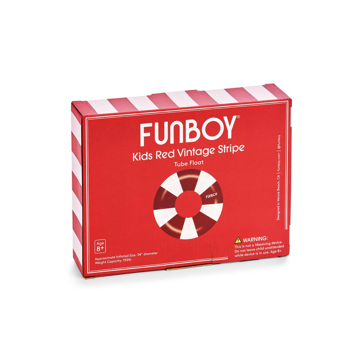 The FUNBOY Vintage Red Stripe Inflatable Kids Pool Float is a must-have for summer fun! This 34” swim ring features a bold red stripe design, bringing a classic, timeless look to any pool day. Lightweight and easy to pack, it’s perfect for pool parties, beach trips, and vacations. Made from durable materials, this float ensures hours of effortless play and relaxation in the water. Suitable for ages 8+.