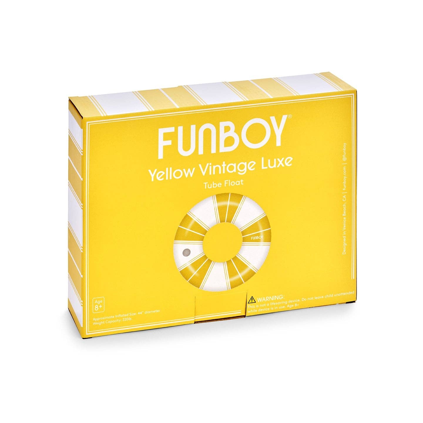FUNBOY Vintage Lux Stripe 48" Tube Ring Style Pool float with Integrated Cup Holder in a yellow colorway.